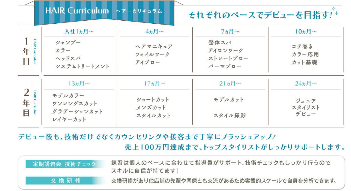 入社前は「美容室って先輩が怖そう…」というイメージがありましたが、実際に入ってみると不安はすぐになくなりました。営業後には先輩が練習に付き合ってくれ、「ここをこうしてみよう」と一人ひとりに丁寧に向き合ってくれます。また、スタイリストデビュー後も指名売上100万円達成までサポートしてくれるカリキュラムがあり、安心して成長できます。スタッフ同士の仲も良く、困った時もすぐに相談できる環境で、毎日楽しく働けています。