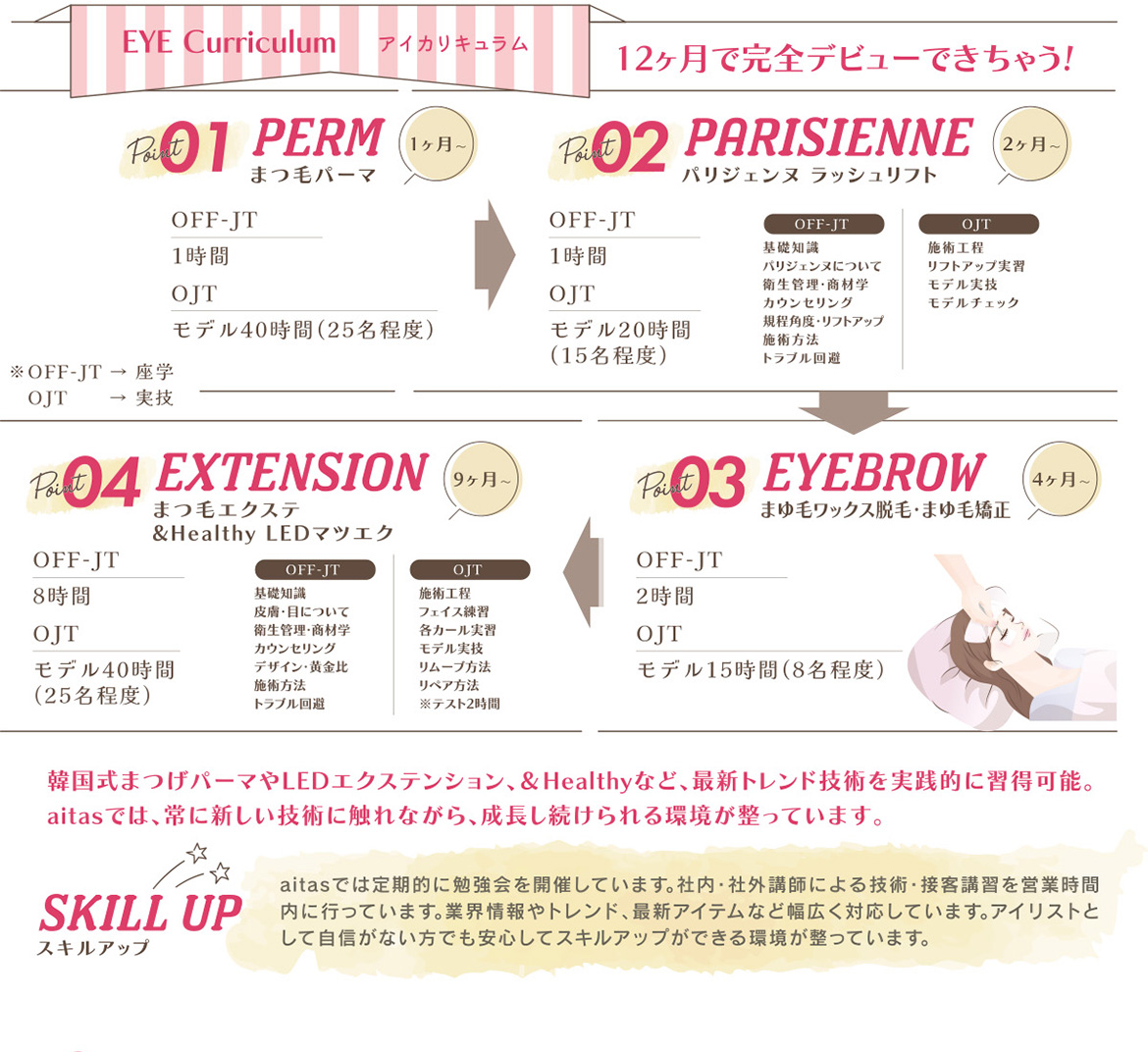 近年、まつ毛エクステやラッシュリフト、眉スタイリングなどのアイゾーンビューティーは、女性の自然な美しさを引き出す欠かせない美容メニューとして定着しています。aitasでは韓国との技術交流を大切にし、定期的な勉強会やトレンド共有を通じて、常に技術と知識の向上に取り組んでいます。また、韓国まつ毛専門家協会「curl made」 日本千葉支部として最新技術を取り入れた施術と教育にも力を入れています。未経験の方でも安心して学べるカリキュラムと丁寧な指導体制により、短期間でのデビューを目指せる環境です。